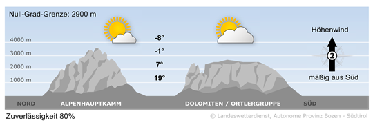 Zunächst scheint verbreitet die Sonne, am Nachmittag nehmen von Süden her die Wolken zu. Die Höchstwerte reichen von 20° im Wipptal bis 24° im Unterland.