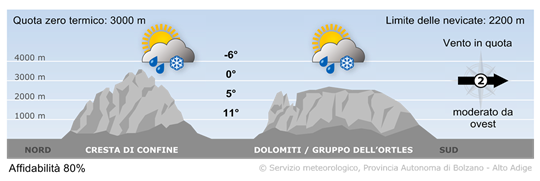 La giornata inizierà con precipitazioni diffuse, nevose oltre 2200 m di quota. Con il passare delle ore da ovest arriveranno delle schiarite ad iniziare dall'Alta Venosta.