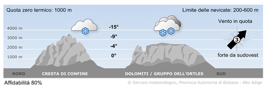 Durante la mattinata inizierà a nevicare diffusamente, mentre nel pomeriggio le precipitazioni si esauriranno ad iniziare da ovest. Su gran parte del territorio sono attesi 5 cm di neve fresca, sui settori interessati dallo stau da sud, in particolare sulla Val d'Ultimo, fino a 10 cm circa.