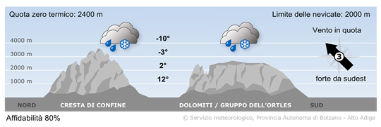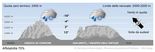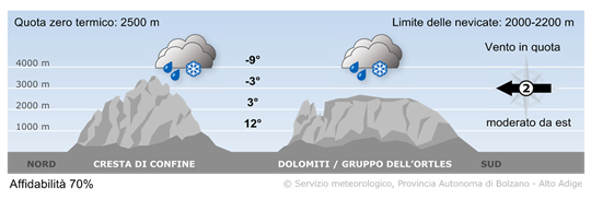 Su tutti i gruppi montuosi domineranno le nubi con precipitazioni diffuse, nevose oltre 2000/2200 m di quota. In serata attenuazione dei fenomeni.